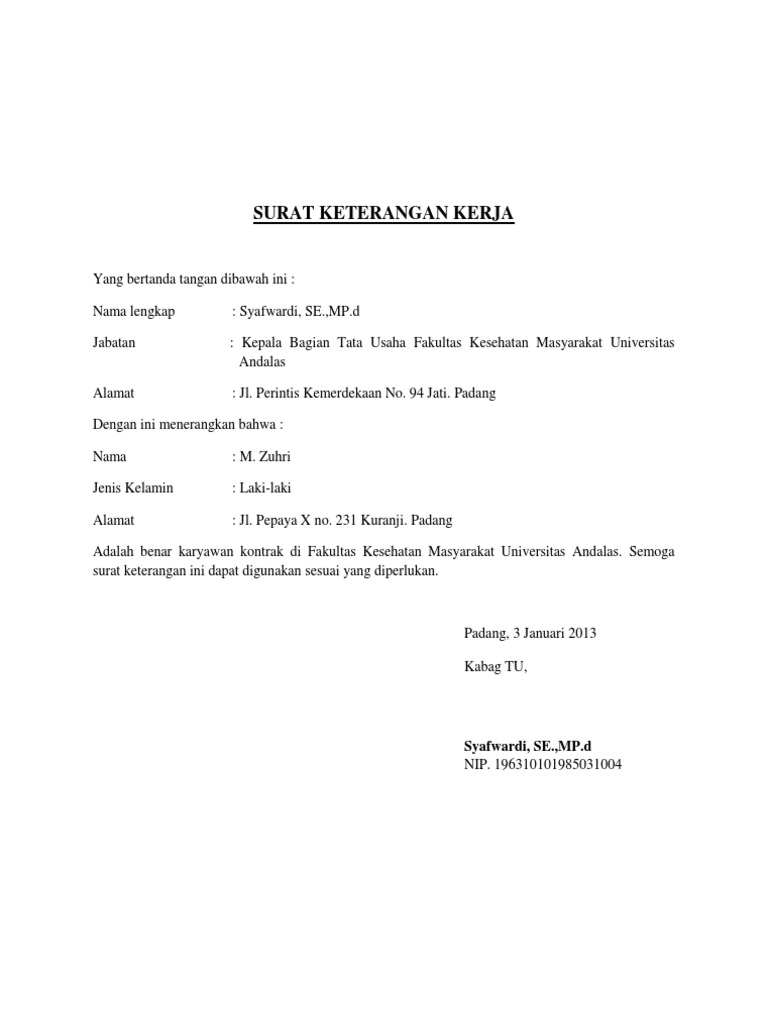 Surat keterangan ini dibuat oleh staff dari perusahaan yang bertujuan. Jika surat keterangan kerja dari perusahaan menunjukan status karyawan tetap, tentu jadi, jika suatu saat nanti ditanyakan kapan sebuah surat dibuat dan dikeluarkan, pegawai bisa. Berikut ini contoh surat keterangan kerja word dalam bahasa inggris yang dapat anda pergunakan. Demikianlah surat keterangan kerja ini kami buat untuk memnuhi syarat pengajuan pembuatan rekening di 3. Surat yang menerangkan isinya seseorang tentang sesuatu hal, ini pengertian surat keterangan secara umum. Contoh surat keterangan kerja berikutnya adalah untuk guru kontrak. Berbeda dengan perjanjian kerja waktu tertentu yang diperuntukkan bagi karyawan kontrak, bagi karyawan yang ditetapkan sebagai pegawai tetap akan diberlakukan. Bagi anda guru honorer yang membutuhkan kelengkapan jadi jika anda yang saat ini bekerja sebagai karyawan perusahaan atau pegawai di instansi pemerintahan. Dalam surat keterangan kerja akan ada informasi mengenai biodata singkat pegawai, jabatan, lama bekerja. Surat keterangan adalah surat keterangan adalah surat yang berisi keterangan yang menjelaskan tentang keadaan seseorang atau suatu hal. Malang melintang saekoproyo jalan kebon agung. Contoh surat kontrak kerja yang sering diterapkan di indonesia adalah perjanjian kerja waktu tertentu (pkwt) dan perjanjian kerja waktu tidak tertentu (pkwtt). Download contoh surat perjanjian kerja, surat yang mengikat hubungan kedua belah pihak selama periode waktu terdapat sejumlah keterangan yang harus dipahami dan disepakati bersama, dan apa itu perjanjian kerja tetap?
