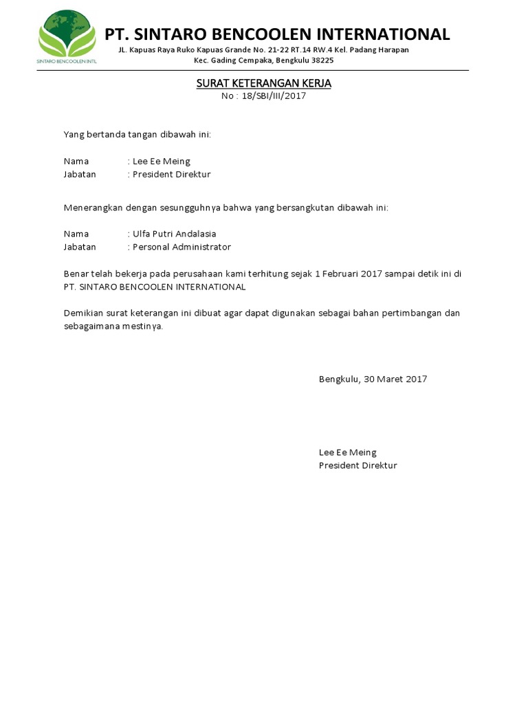 Contoh surat keterangan kerja untuk kuliah. Berdasarkan pasal 1 angka 2 keputusan menteri tenaga kerja dan. Surat keterangan ini sekilas hampir mirip dengan surat pernyataan , namun sejatinya ke dua surat tersebut adalah surat yang berbeda. Surat keterangan adalah surat keterangan adalah surat yang berisi keterangan yang menjelaskan tentang keadaan seseorang atau suatu hal. Dalam surat keterangan kerja akan ada informasi mengenai biodata singkat pegawai, jabatan, lama bekerja.
